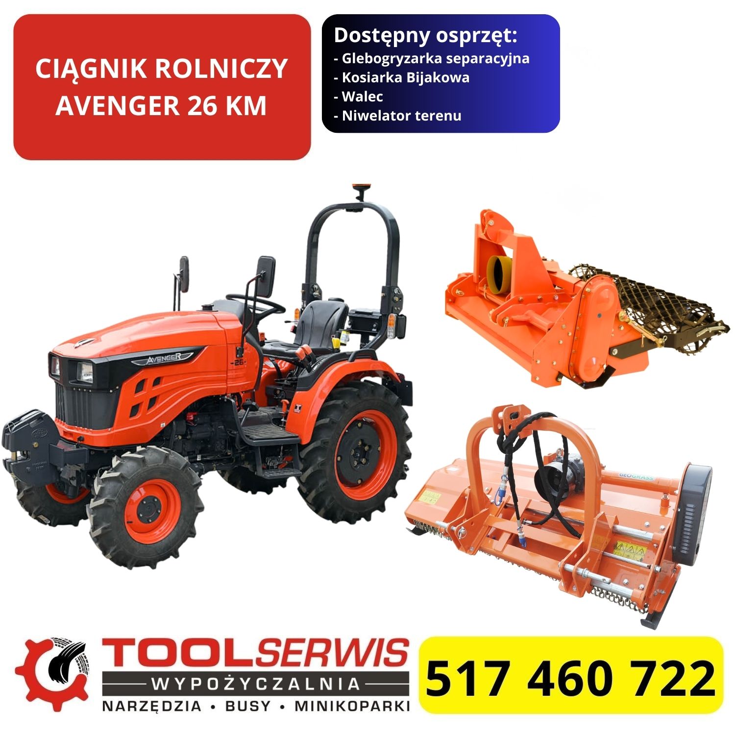 Ciągnik Avenger 26KM z osprzętem to uniwersalne rozwiązanie do prac polowych i ogrodniczych. Wyposażony w glebogryzarkę separacyjną, która skutecznie spulchnia i przygotowuje glebę. Kosiarka bijakowa sprawdza się przy koszeniu wysokiej trawy i nieużytków. Walec zapewnia wyrównanie oraz zagęszczenie podłoża. Niwelator terenu gwarantuje precyzyjne przygotowanie powierzchni pod dalsze prace. Maszyna jest solidna, wydajna i niezawodna, dlatego idealnie sprawdzi się w gospodarstwach rolnych i firmach usługowych.